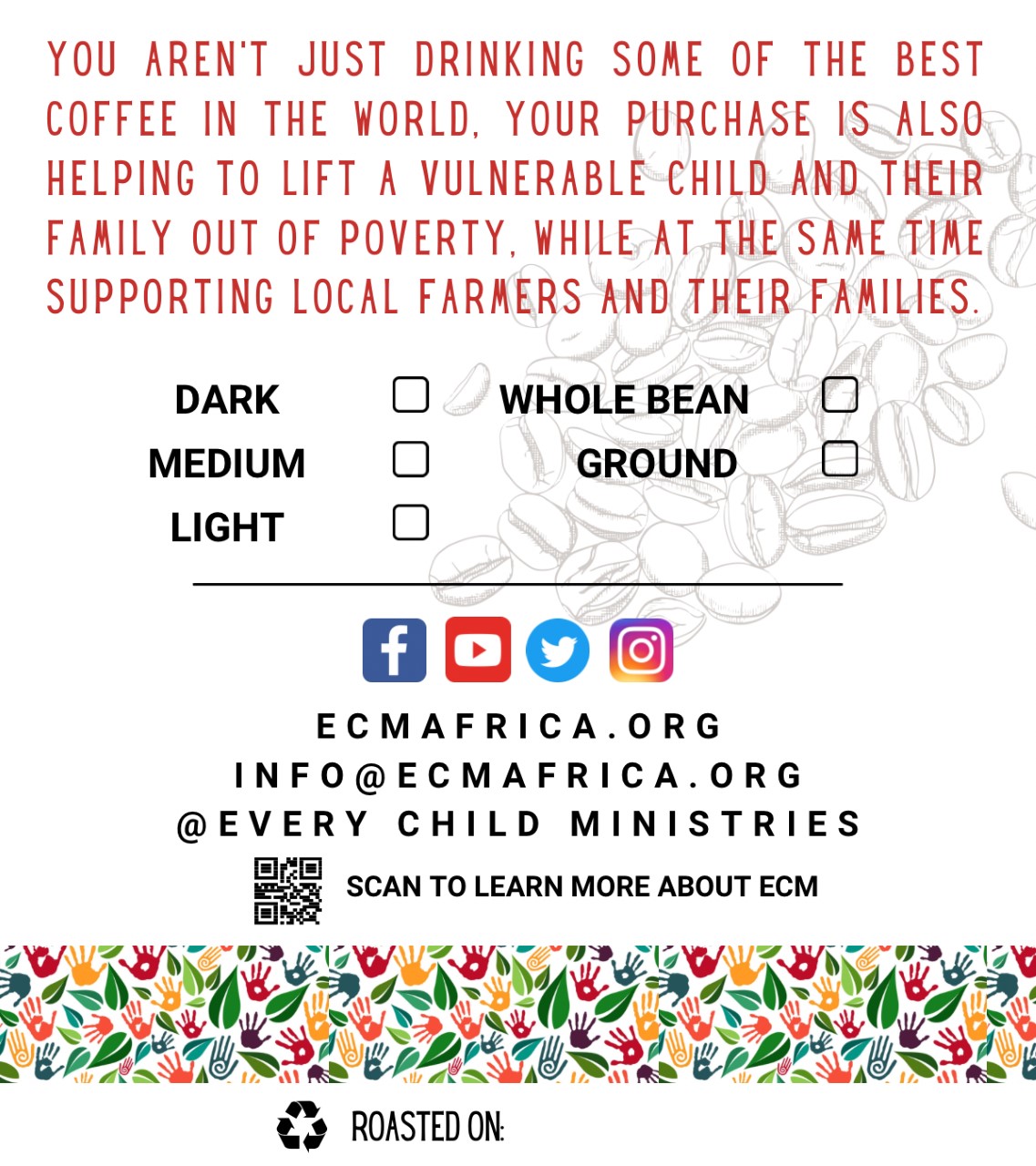 *Light Roast coffee only available by special order (ten bag minimum order), contact our office at 219-996-4201 or by email info@ecmafrica.org